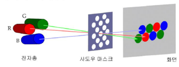 컬러 모니터에는 3개의 전자총이 사용되는데, 전자총과 화면 사이에는 섀도우 마스크(Shadow Mask)가 있고, 여기에는 아주 미세한 구멍이 뚫려 있다. 전자빔 중 이 구멍을 통과한 전자들만 화면에 도착하도록 함으로써 각 전자총이 정확히 해당 색상을 인점을 맞추게 되어 있다. 섀도 마스크가 없다면 빨강 인점을 향한 전자빔이 휘는 경우 동일 화소 또는 인접 화소의 다른 인점을 자극할 수도 있기 때문에 섀도 마스크 기술은 화면의 선명도와 직결된다고 할 수 있다. 그림에서 나타낸 섀도 마스크는 인점이 트라이어드 방식으로 배열된 경우에 주로 사용된다.