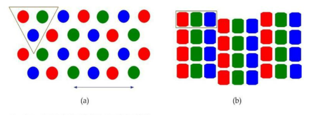 | (a) 트라이어드(Triad)방식 삼각형 내부 3개의 인점이 모여서 한 화소를 구성하는 데 이 경우 인접 화소는 서로 엇갈려서 구성된다. (a) 의 역삼각형 화소의 바로 오른쪽 화소는 삼각형 모양이 된다. 트라이어드 방식의 인점은 이처럼 서로 교대하면서 상하좌우로 반복 진행된다. |