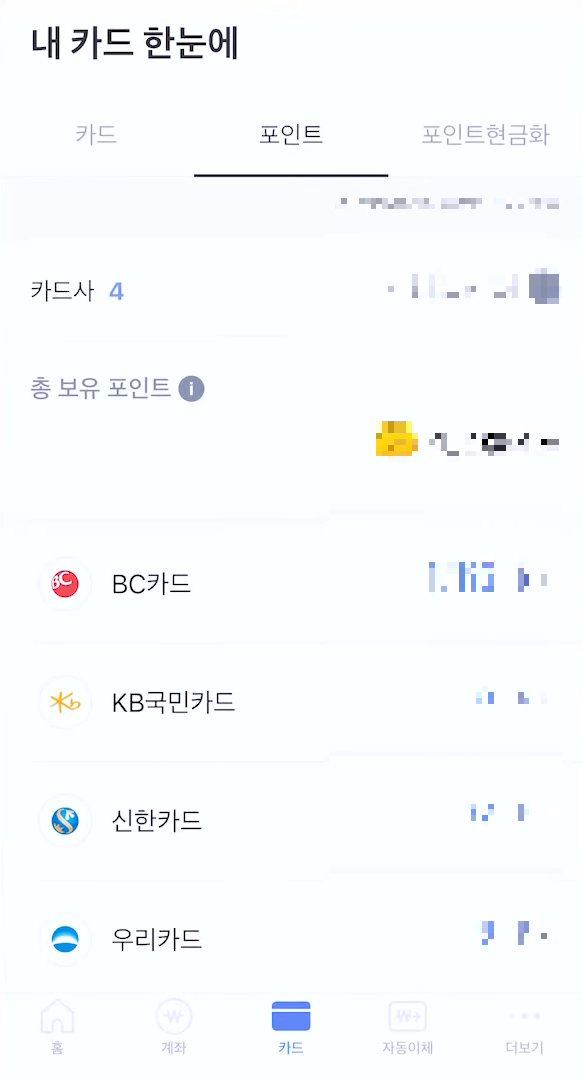 홈에서 카드탭으로 이동하면 보유 카드 리스트가 나오고 총 보유 포인트와 각각 카드사의 포인트를 한눈에 확인이 가능합니다. 그리고 각각의 카드 탭을 클릭하면 소멸 예정일과 소멸예정포인트도 확인이 가능합니다.