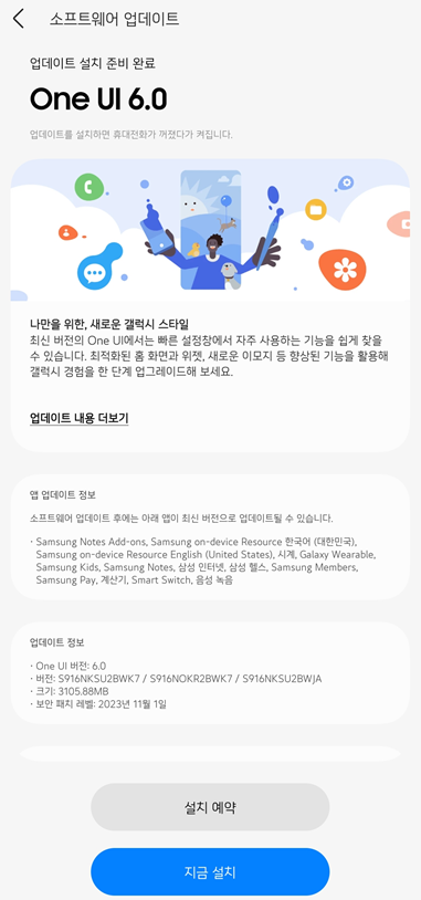 2023년 11월부터 갤럭시 ONE UI가 6.0으로 버전 업그레이드가 되었습니다.