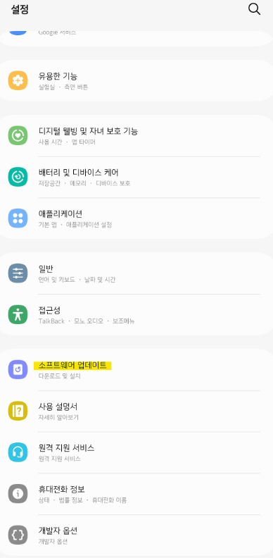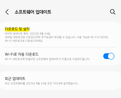 [설정]에 들어가서 [소프트웨어 업데이트]를 누른 후 [다운로드 및 설치] 를 누릅니다.